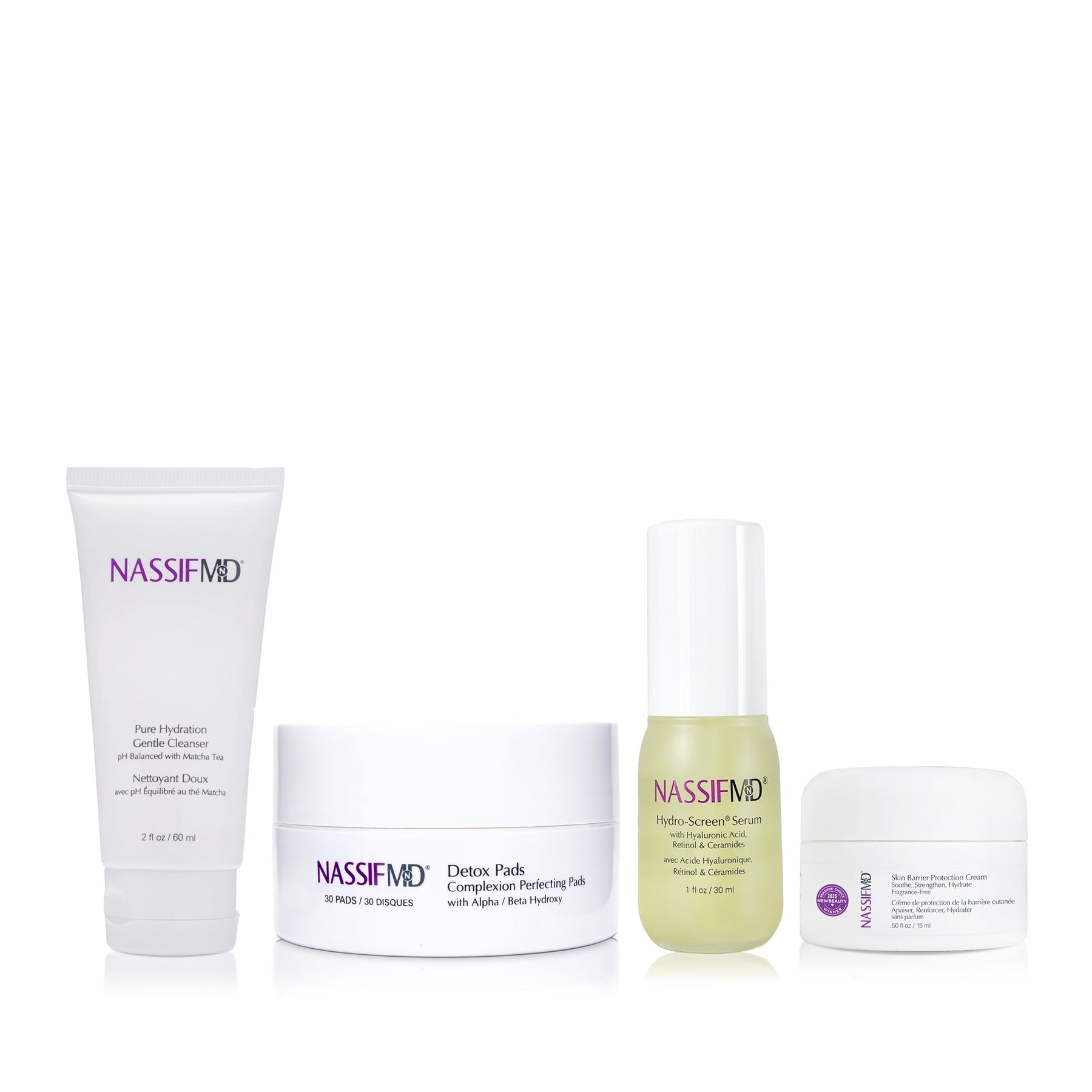 Originally created for Dr. Nassif’s surgical patients, this 4-step system strengthens the skin barrier, smooths texture, and deeply hydrates, which is ideal before and after treatment or as part of your daily routine. Pure Hydration Gentle Cleanser, Detox Pads, Hydro-Screen® Serum, and Skin Barrier Protection Cream work together to exfoliate, replenish, and restore visible radiance.