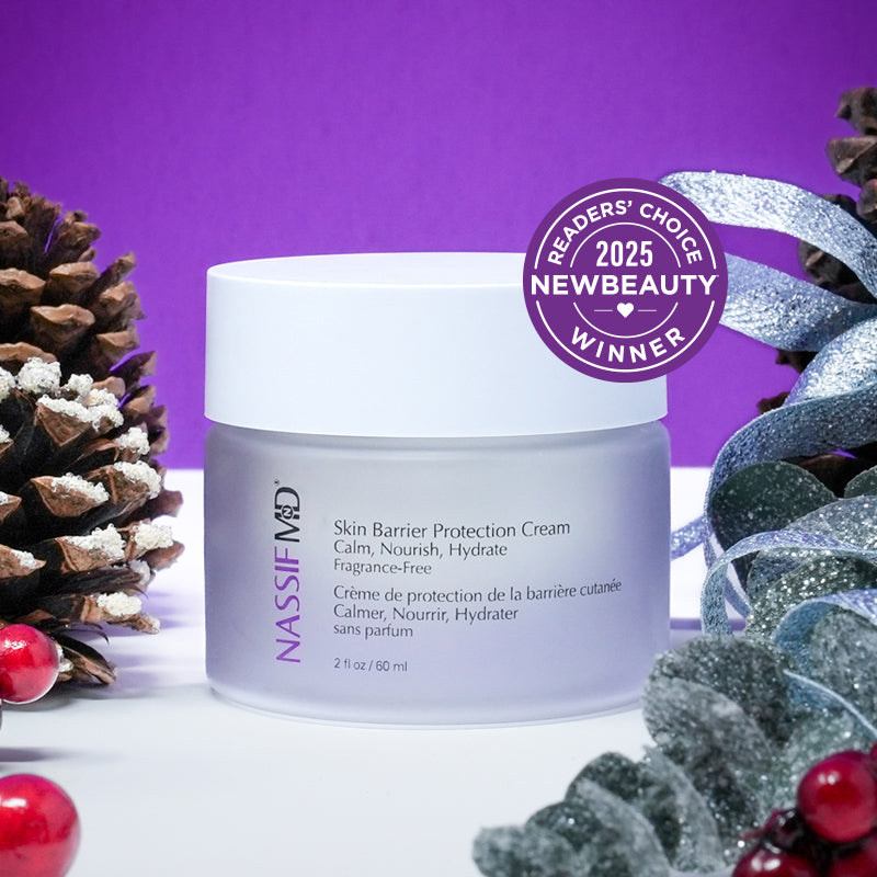 For optimal anti-redness benefits it is important to use gentle, hydrating formulas that calm and soothe the skin. Ingredients like seed oils, aloe vera extracts, niacinamide and hyaluronic acid are ideal for skin prone to redness. Dr. Nassif’s Skin Barrier Balm, formulated with centella asiatica will help calm and soothe skin, clinically proven to strengthen the skin barrier to prevent trans epidermal water loss