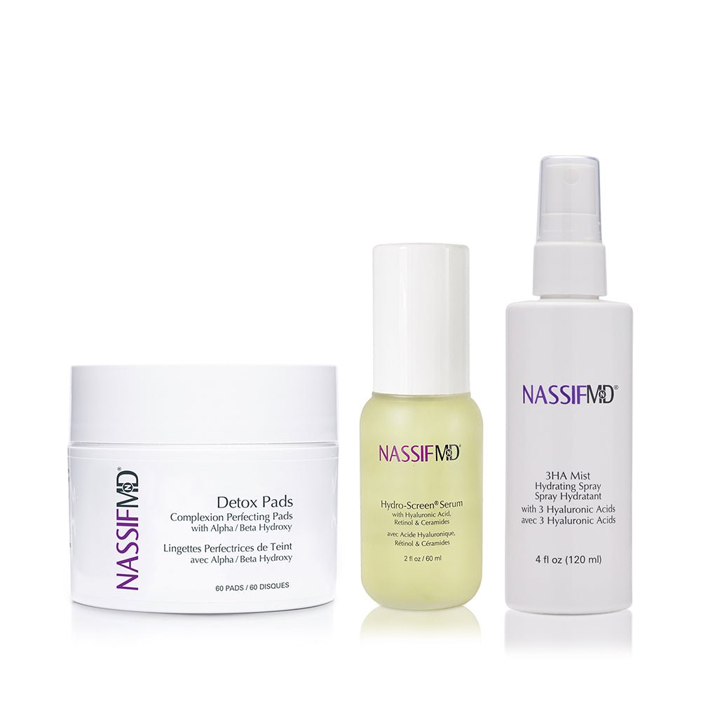 Experience Hollywood-approved glow at home with Red Carpet Routine, the three-step kit inspired by the NassifMD® prep used on Kristen Bell before walking her red carpet movie premier. Detox Pads exfoliate and refine skin texture for a smooth, makeup-ready canvas, while 3HA Instant Hydrating Facial Mist floods skin with three forms of hyaluronic acid for dewy, lasting hydration. Finish with Hydro-Screen Hydrating Serum to plump, nourish, and soften the look of fine lines. Together, these Dr. Nassif approved red-carpet essentials deliver smoother, hydrated, visibly glowing skin that’s ready for every close-up.